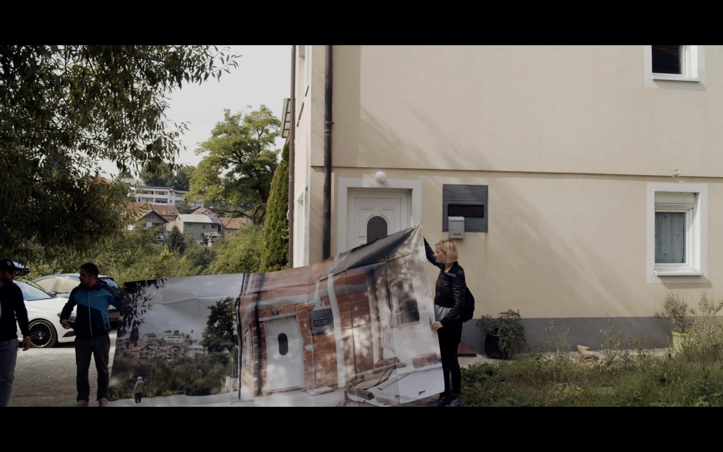 This mixing of the timelines can be felt strongly in "What remains I Šta ostaje I What remains / Re-visited". You return to the places with billboard-sized film stills that show the places from ten years ago. That incites conversation. Some lead back to the atrocities of war, others evade it. The effort to keep life going is always an issue. And then people talk about where they found their dead relatives and who is still missing. There are very different urgencies overlapping, right?
